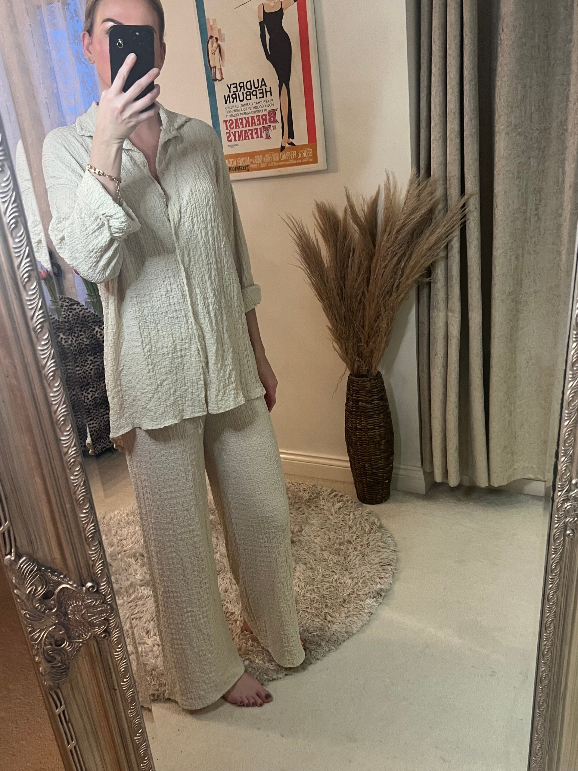 Beautiful relaxed crinkled material. This set is perfect for spring / summer or on holiday you can dress this up of an evening or have it open for beach clubs or pool days. All colours are simply stunning.